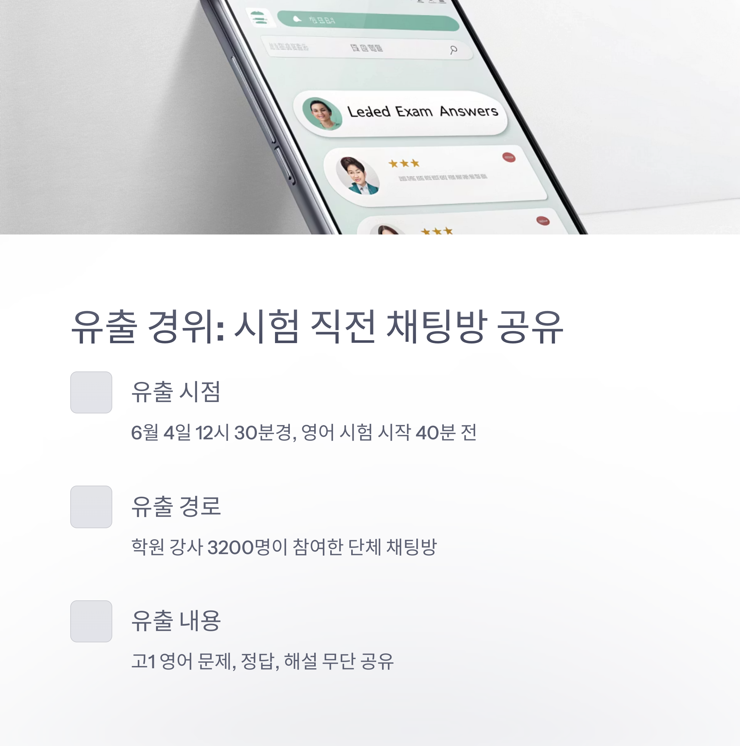 | 유출 경로 | 채팅방 (학원 강사 3200명 참여) |
