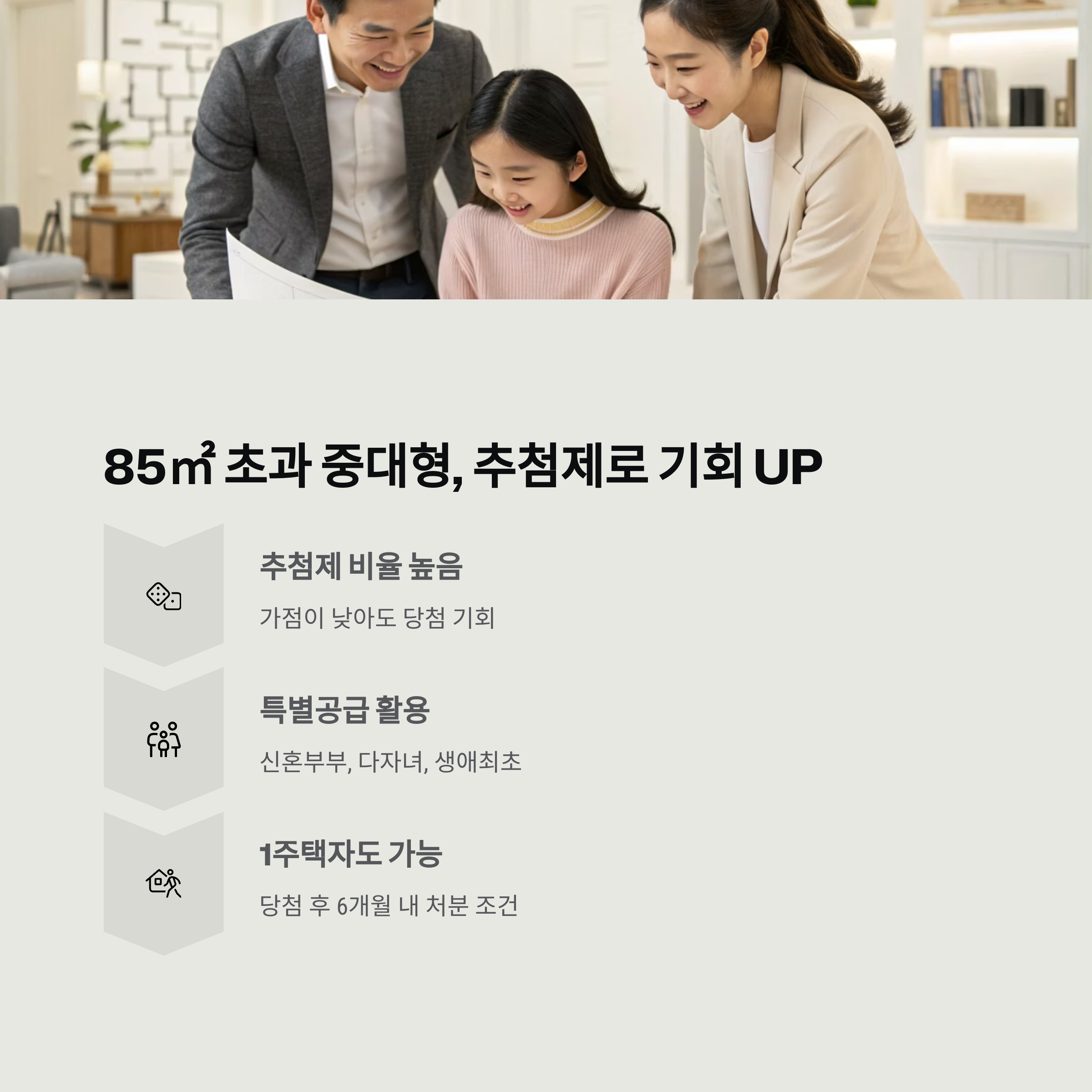 85㎡ 초과 중대형 평형은 추첨제 비율이 높아 무주택 기간이 짧거나