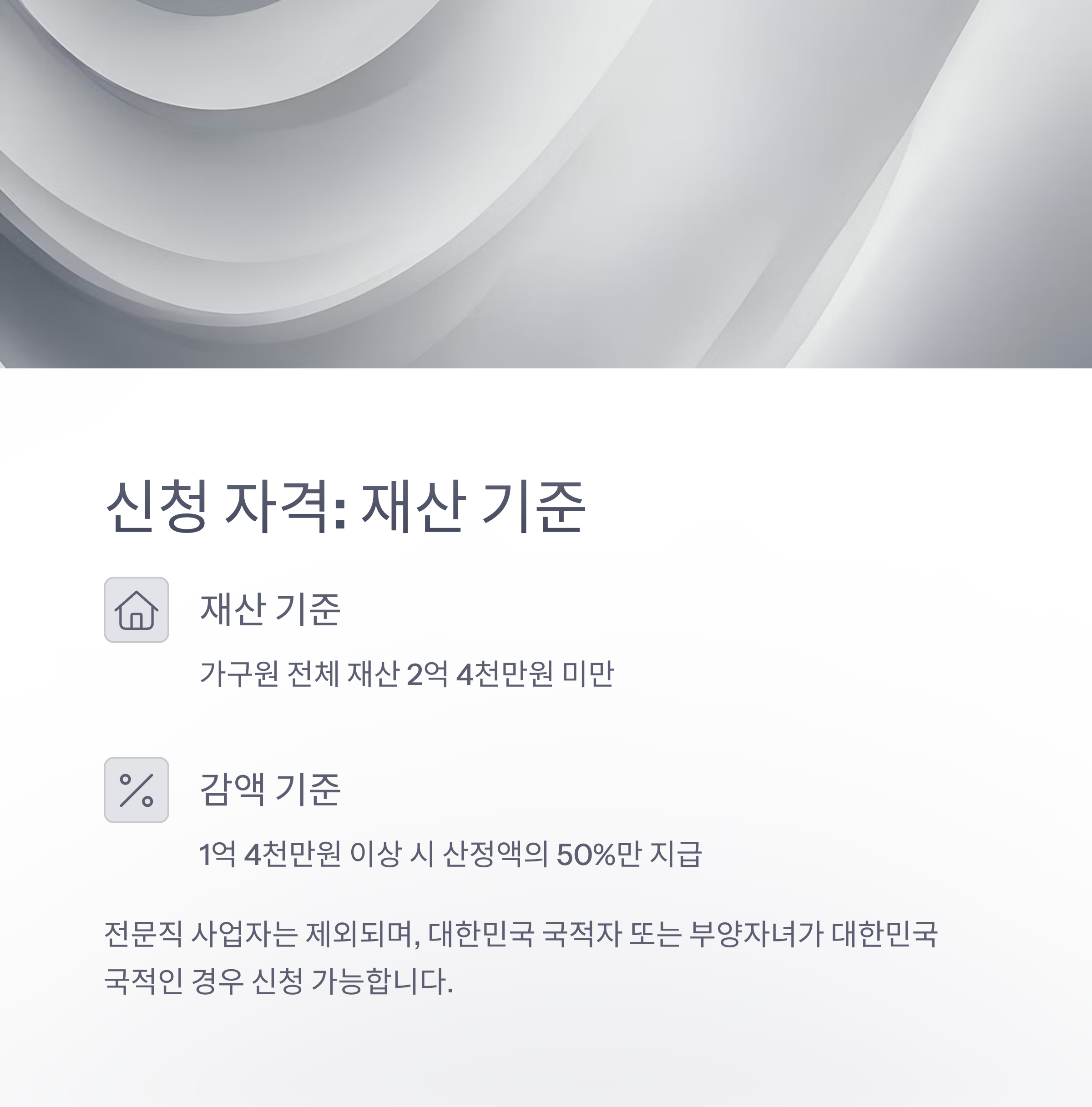 재산이 1억 4천만원 이상 2억 4천만원 미만일 경우 산정액의 50%만 지급됩니다.