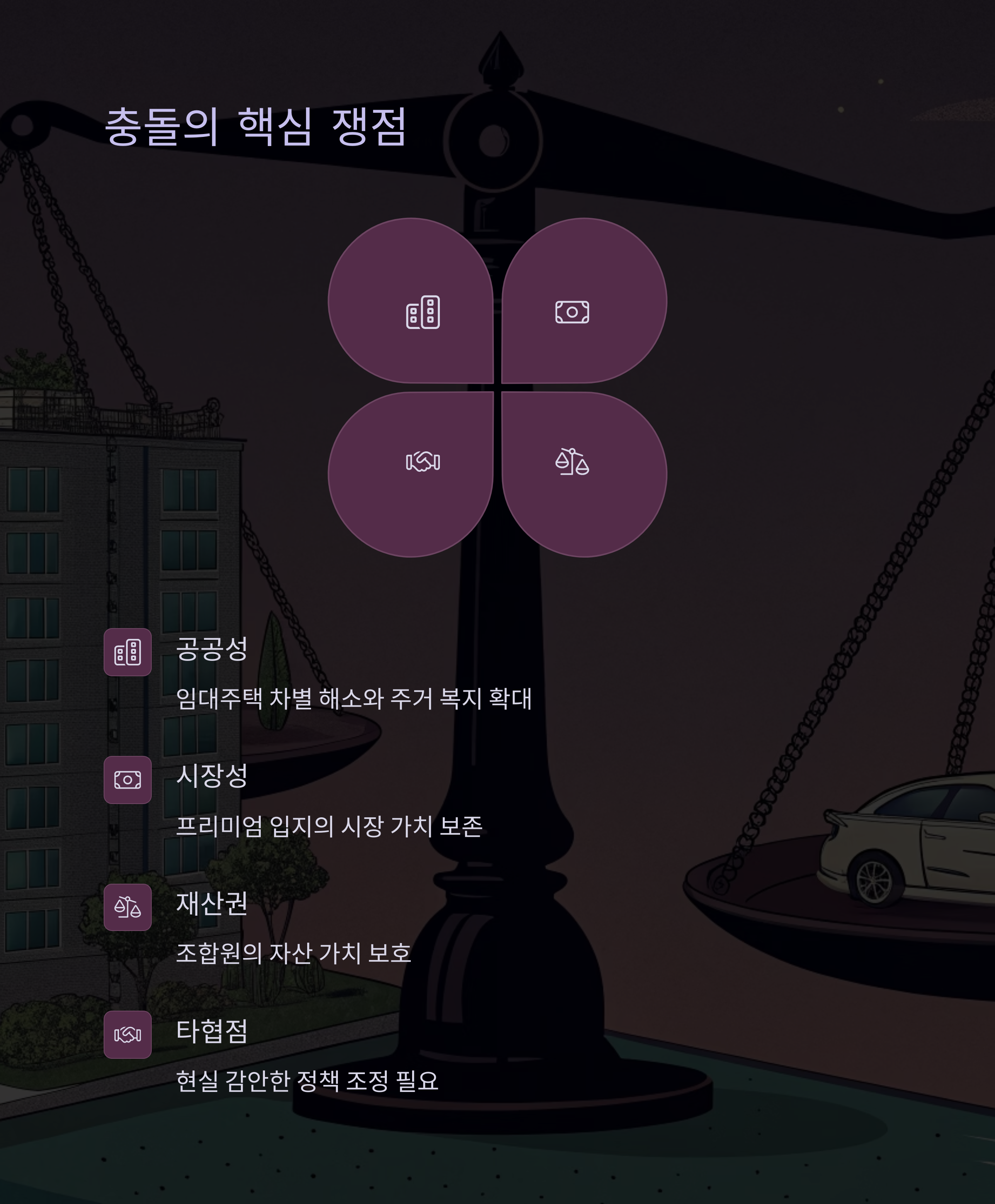 | 정책 목적 | 소셜믹스 구현, 주거 차별 해소 | 조합원 자산 보호, 수익 극대화 |