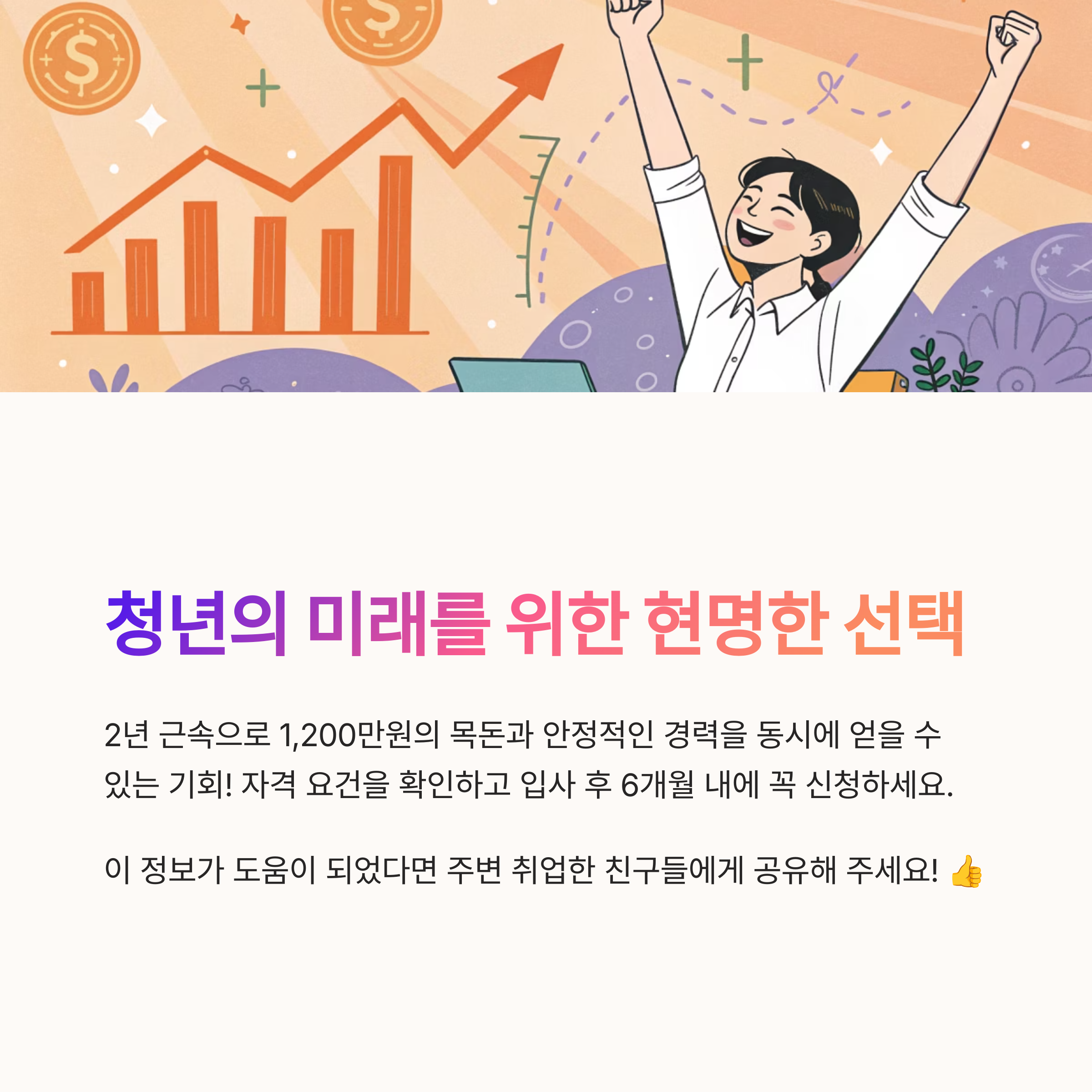 2년 후 목돈 1,200만원(이자 별도)을 수령할 수 있도록 설계된 제도입니다.