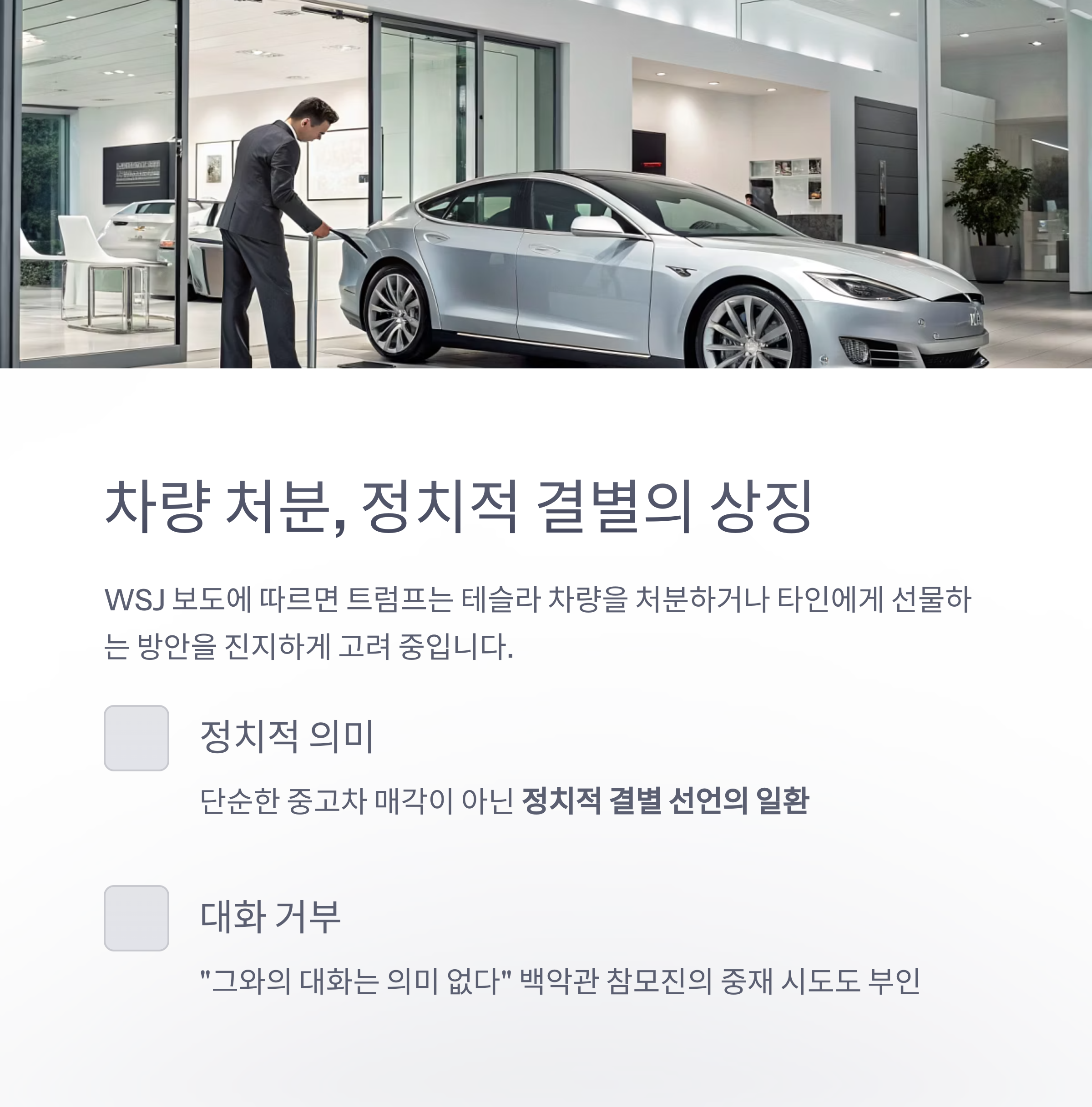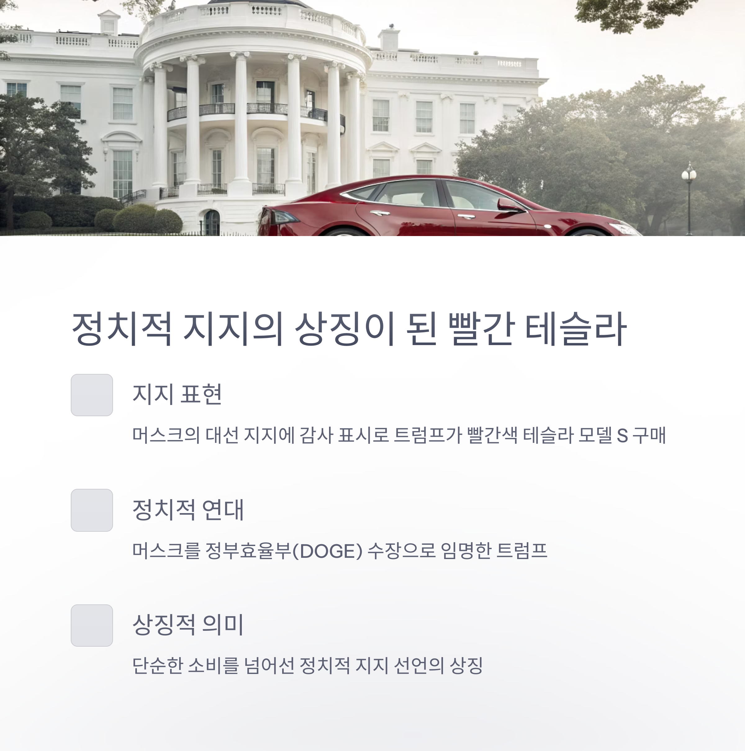 | 핵심 조치 | 트럼프, 테슬라 모델 S 차량 처분 고려 |