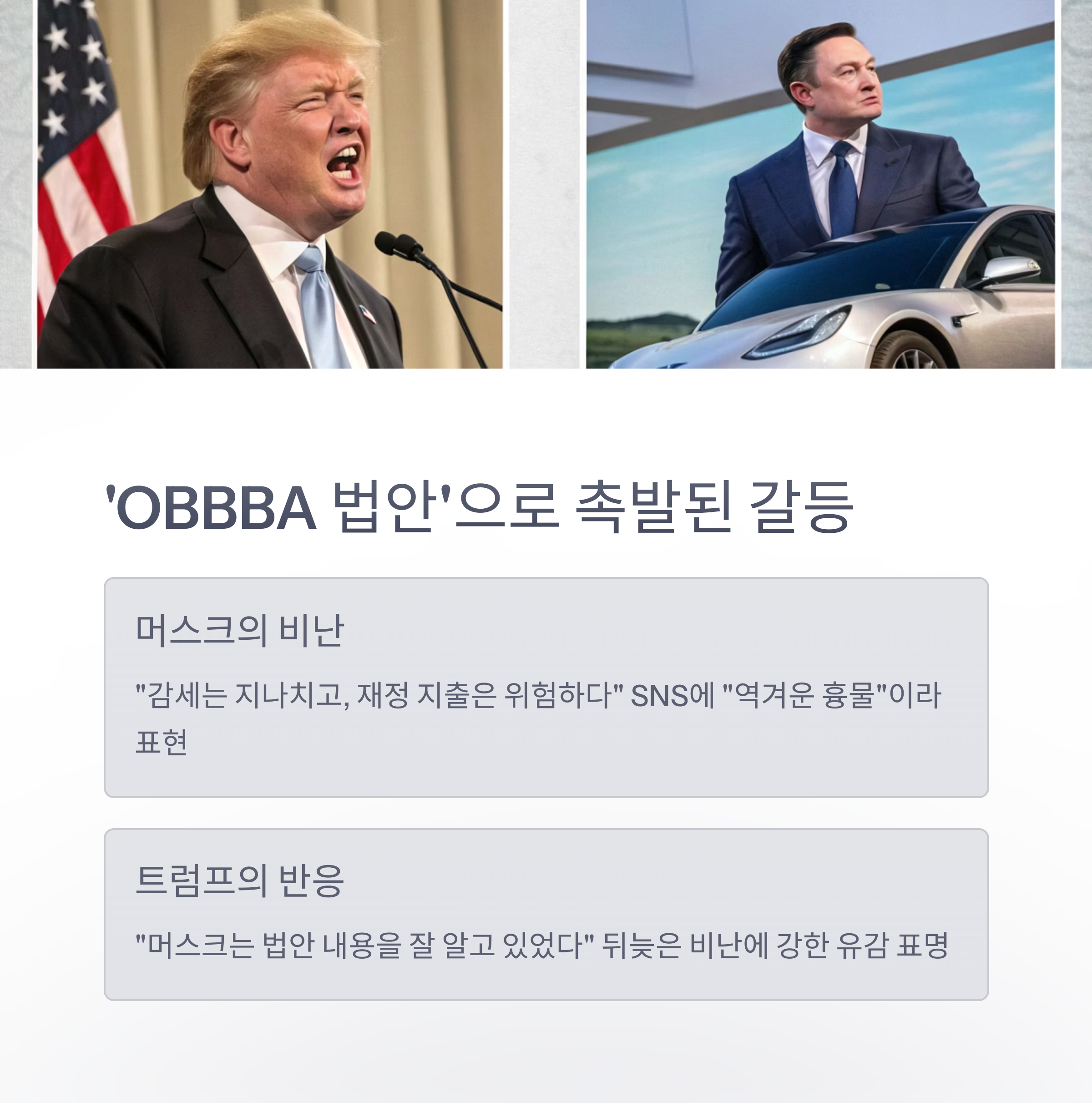 | 사건 배경 | OBBBA 법안 반대로 트럼프-머스크 갈등 격화 |
