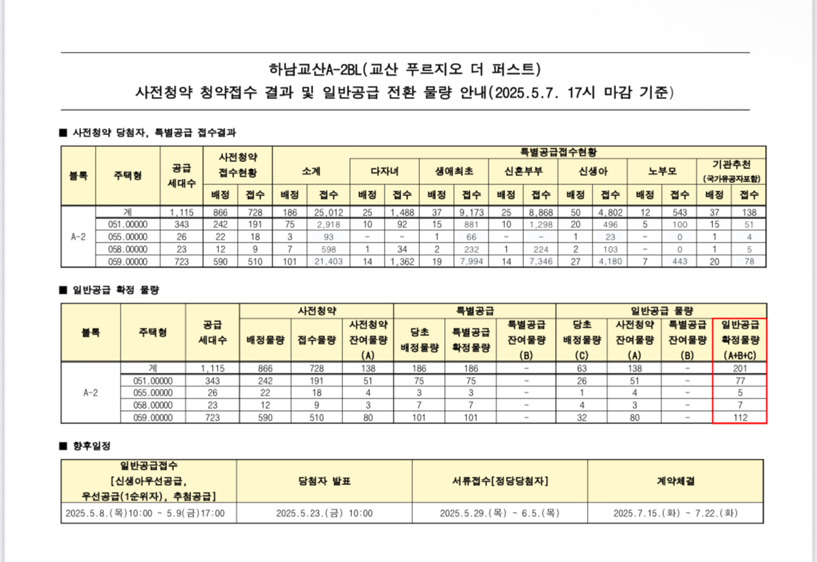 2025년 5월 7일 기준, 하남 교산 푸르지오 더 퍼스트 A2블록의 본청약 특별공급 접수가 마감되면서 **일반분양 확정 물량이 201가구**로 최종 집계되었습니다. 이번 결과는 **사전청약 포기 + 특별공급 미접수 물량의 전환분이 포함된 수치**로, 청약 대기자들에게 또 한 번의 기회가 열렸다는 평가를 받고 있습니다.