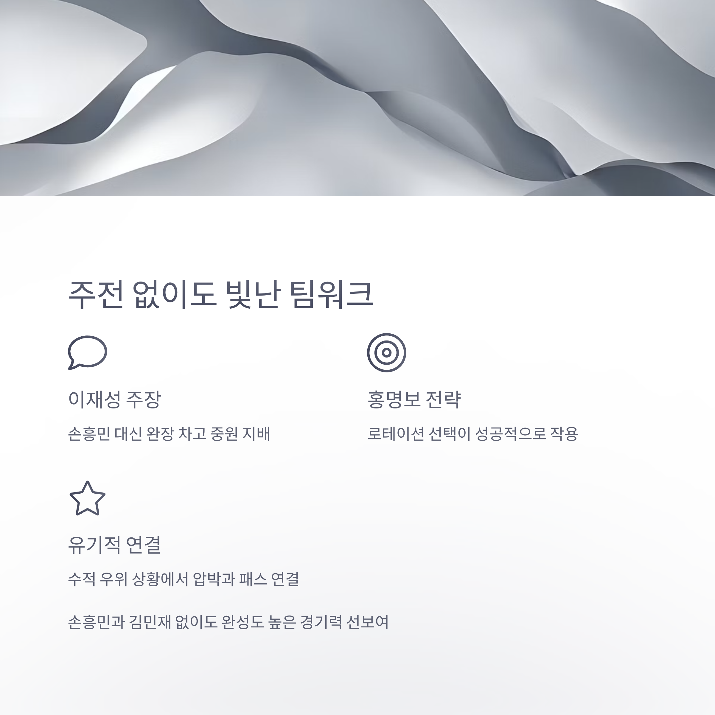 경기 운영에서는 특히 수적 우위 이후의 전략적 압박과 유기적인 패스 연결이 돋보였고,