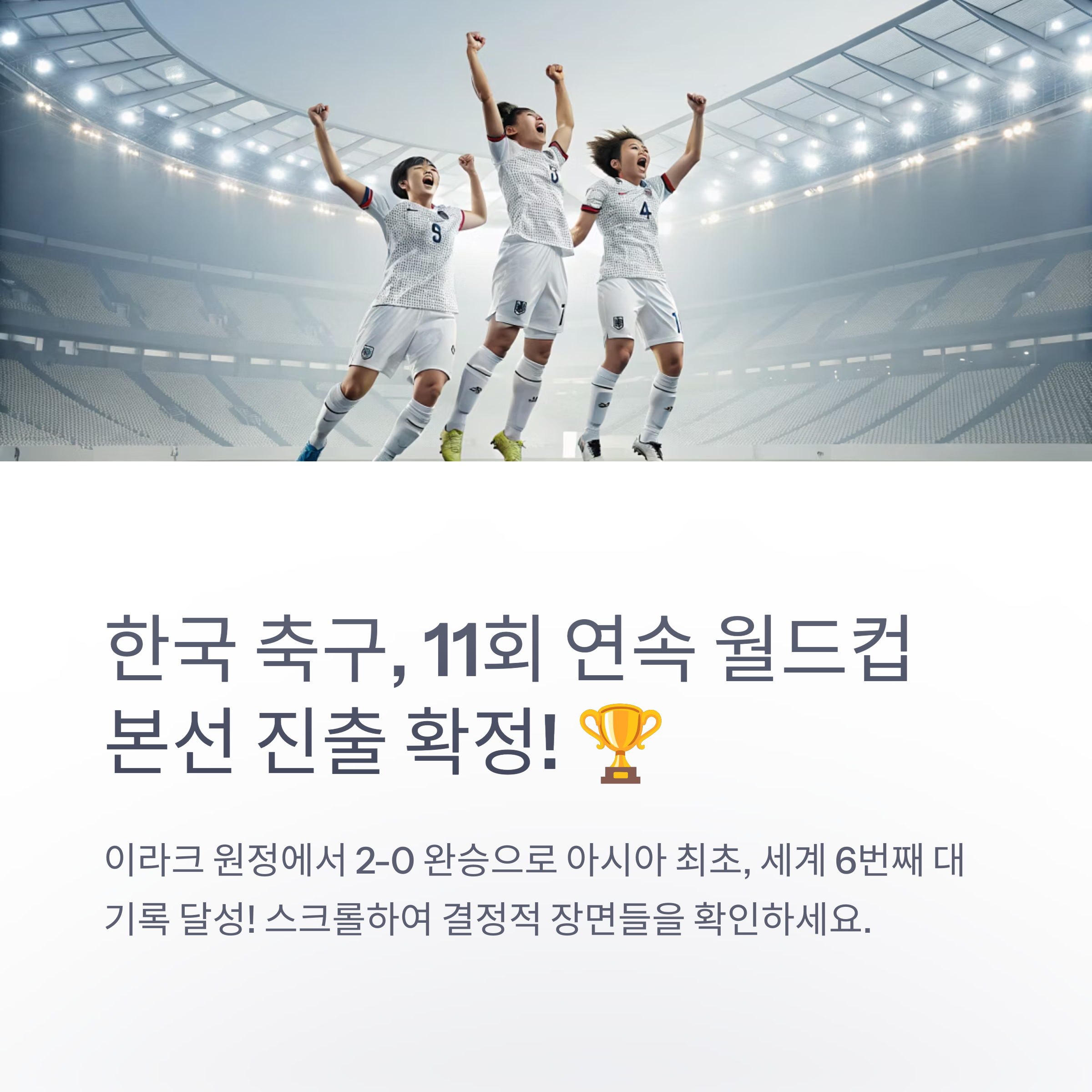 한국은 이번 이라크전 승리로 아시아 최초, 세계 6번째 11회 연속 본선 진출국이 되었습니다.