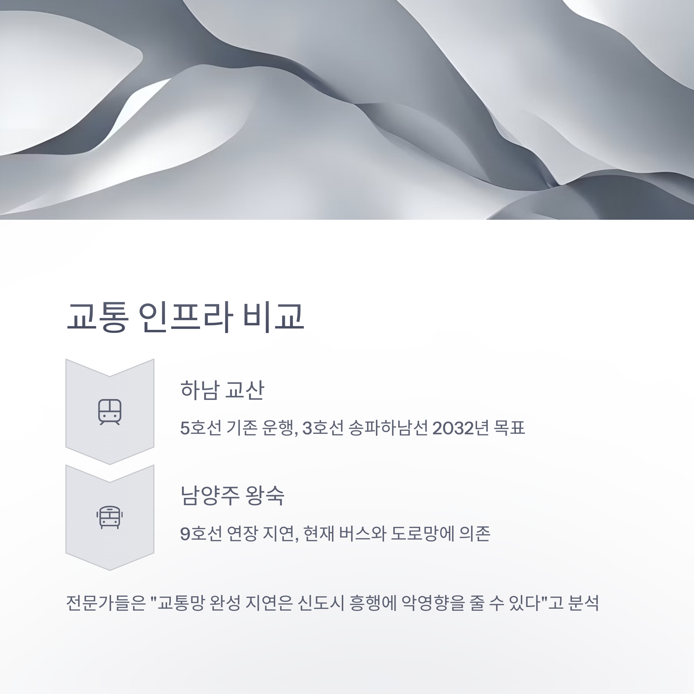 반면 남양주 왕숙은 서울 동북부에 인접했지만, 현재는 교통 인프라가 제한적입니다.