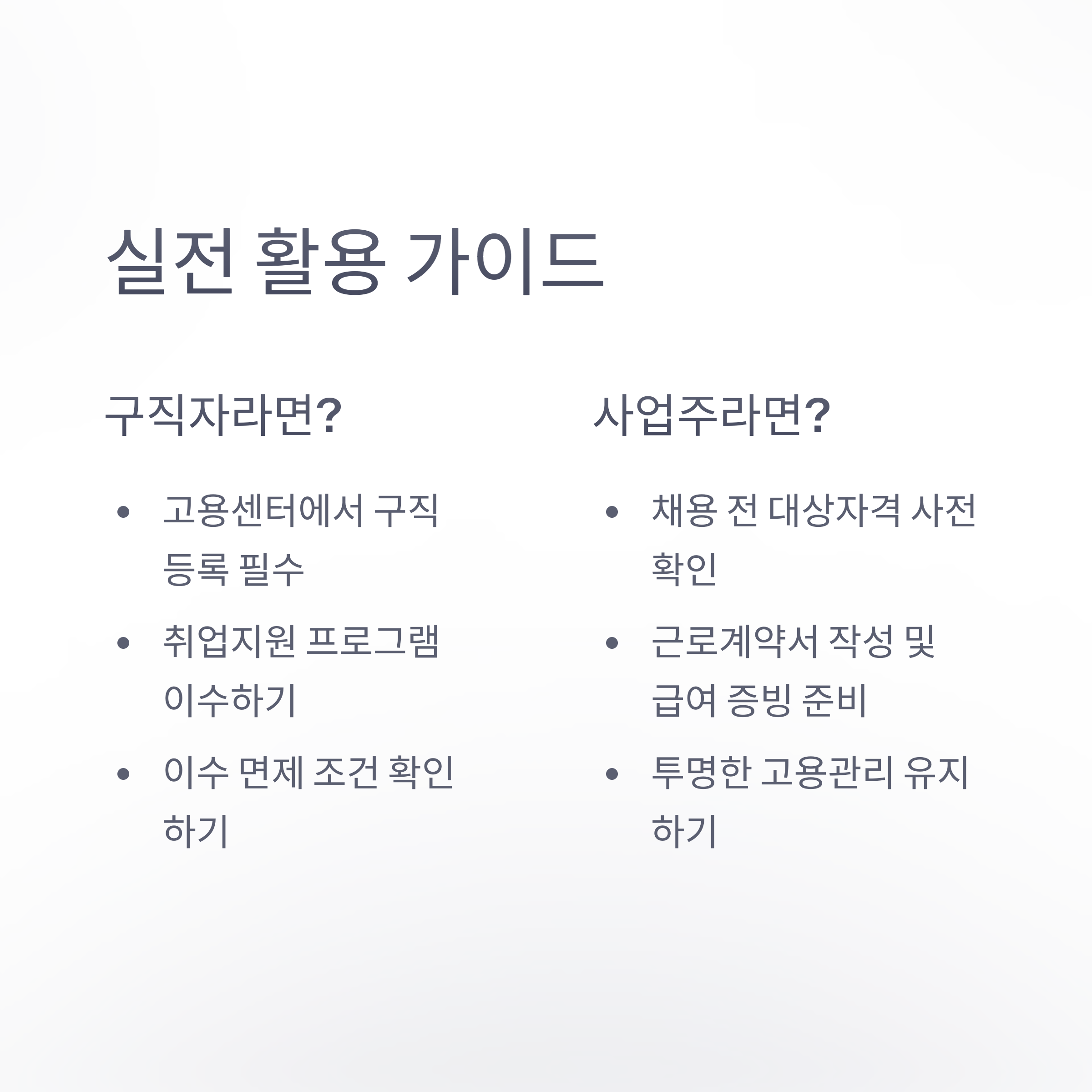 - 고용 후 근로계약서 작성과 통장 입금 등의 투명한 급여 증빙이 중요합니다.