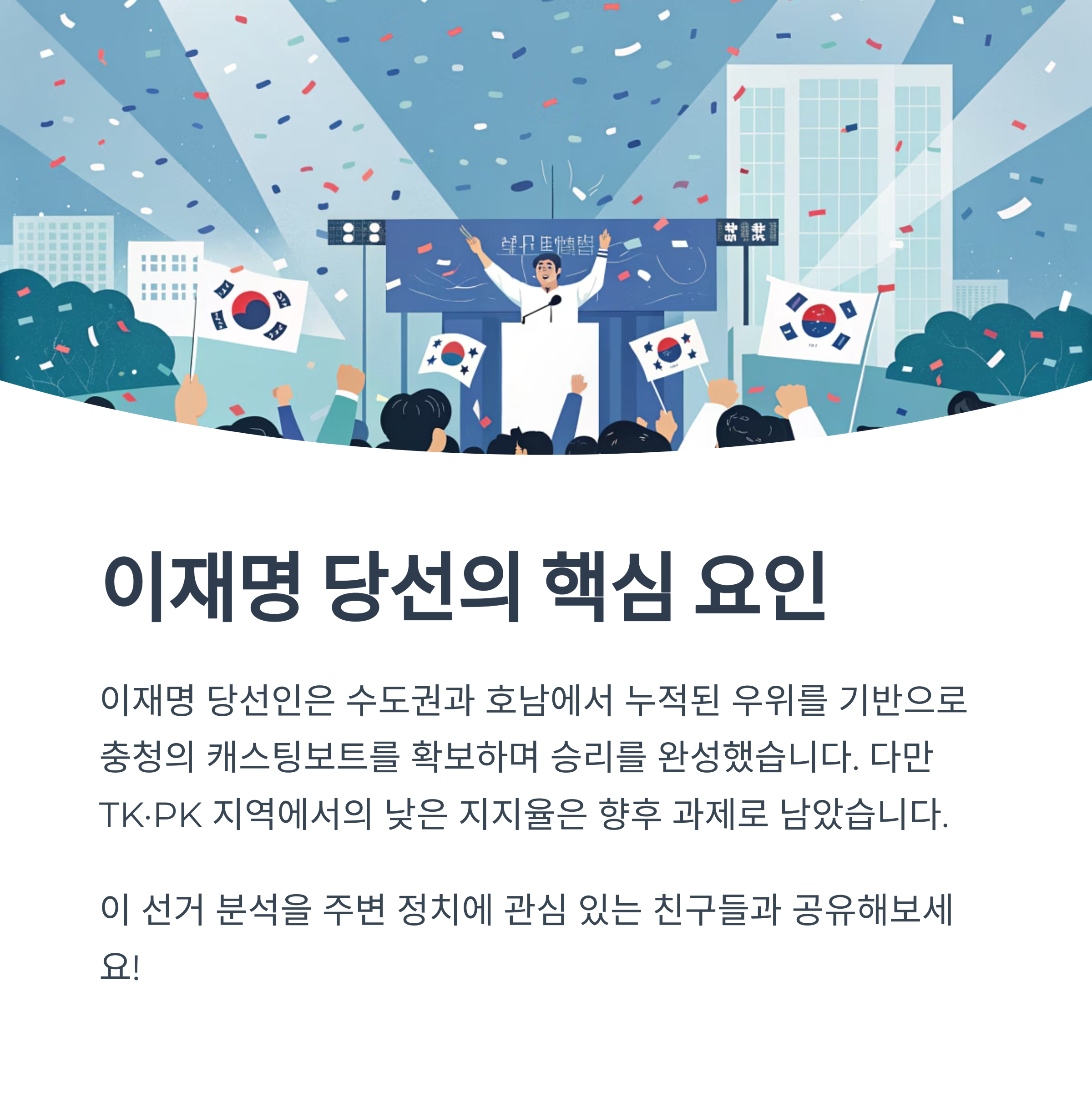 이재명 당선인은 수도권과 호남에서 누적된 우위를 기반으로 충청의 캐스팅보트를 확보하며 승리를 완성했습니다